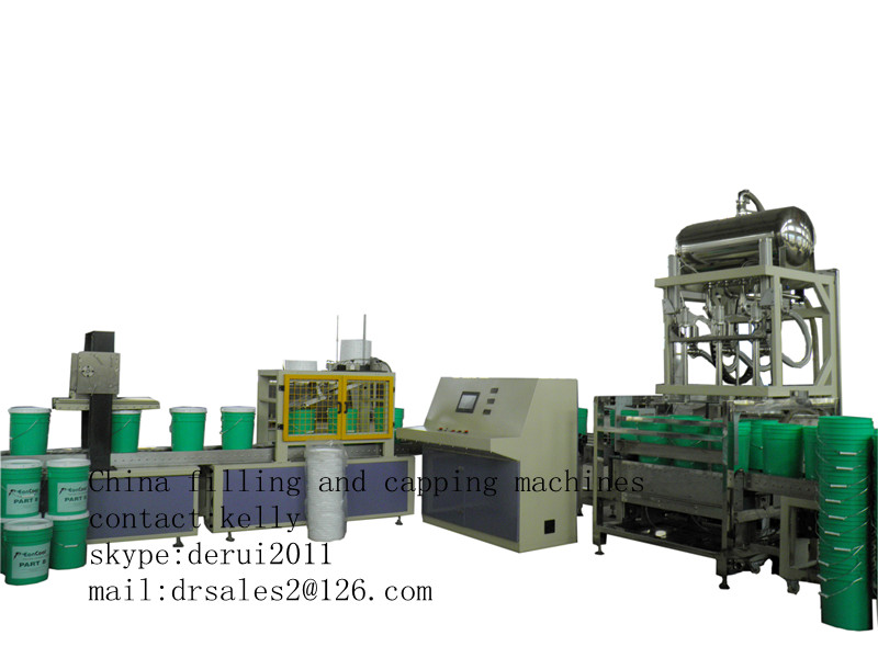 Coating filling machine is composed of SS roller conveyor, filling postion, feeding cap, capping, electrical control, pneumatic control and vacuum control. Manual feeds drum at inlet of conveyor, which is conveyed to feeding position, when sensor checks drum, weighing position stays to wait, pusher pushes drum to filling and weighing platform. The sensor checks drum, open filling nozzle and feeding valve automatically, fast filling to set value, feeding valve closes and slow filling, to set value, filling nozzle closes. After feeding cap, pusher pulls the drum to conveyor to feeding cap. When the sensor checks drum, stop it and catch cap rotate then put it on the drum, then to capping position. When capping sensor checks drum also stop it then cap it, after that, capping head resets, orientator releases it to be discharged out.